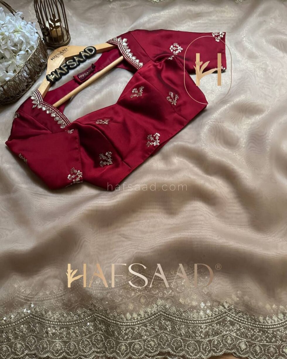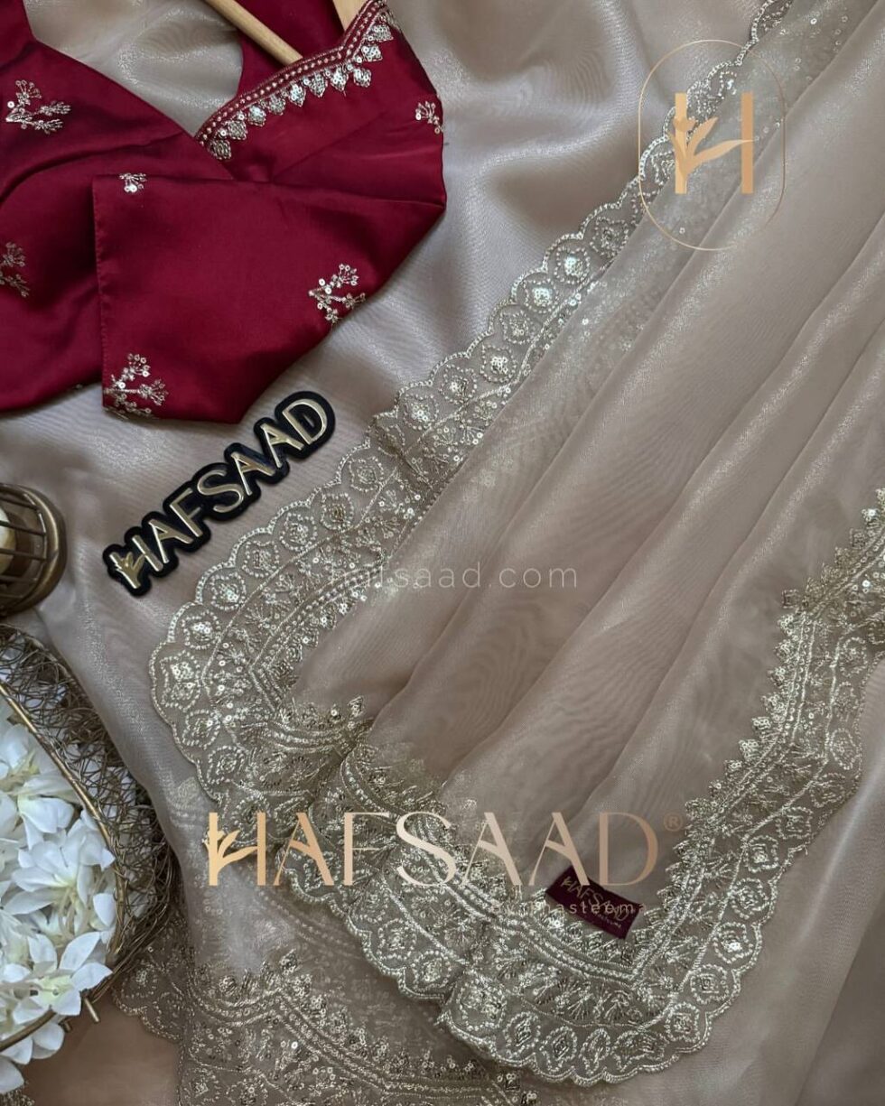 Presenting an exclusive designer creation from Nice Creation, Design No. NC – 5441. This stunning saree is crafted from Heavy Soft Nylon Organza, offering a graceful drape. It features intricate sequins and Zari embroidery work throughout, creating a dazzling effect. The ensemble is completed with a matching blouse in Soft Satin, adorned with coordinating Zari and sequins embroidery. This exquisite and radiant saree is available for β‚Ή4,698.00, perfect for making a statement.